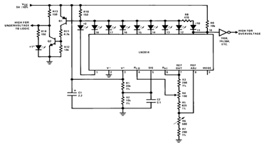 Constructing Voltmeter Monitor Circuit using LM3914 -With a few resistors, LEDs and using a LM3914 bar/dot display driver IC we can construct a simple 5V Voltmeter Monitor Circuit which provides TTL-compatible undervoltage and overvoltage warning signals. A complete circuit can be shown in the schematic below.